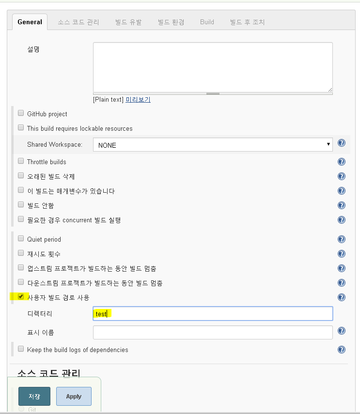 test라고 세팅을 해주면 job이 있더라도 새로 선택한 저 위치 빌드 경로가 되며, 형상관리 소스를 받아준다.