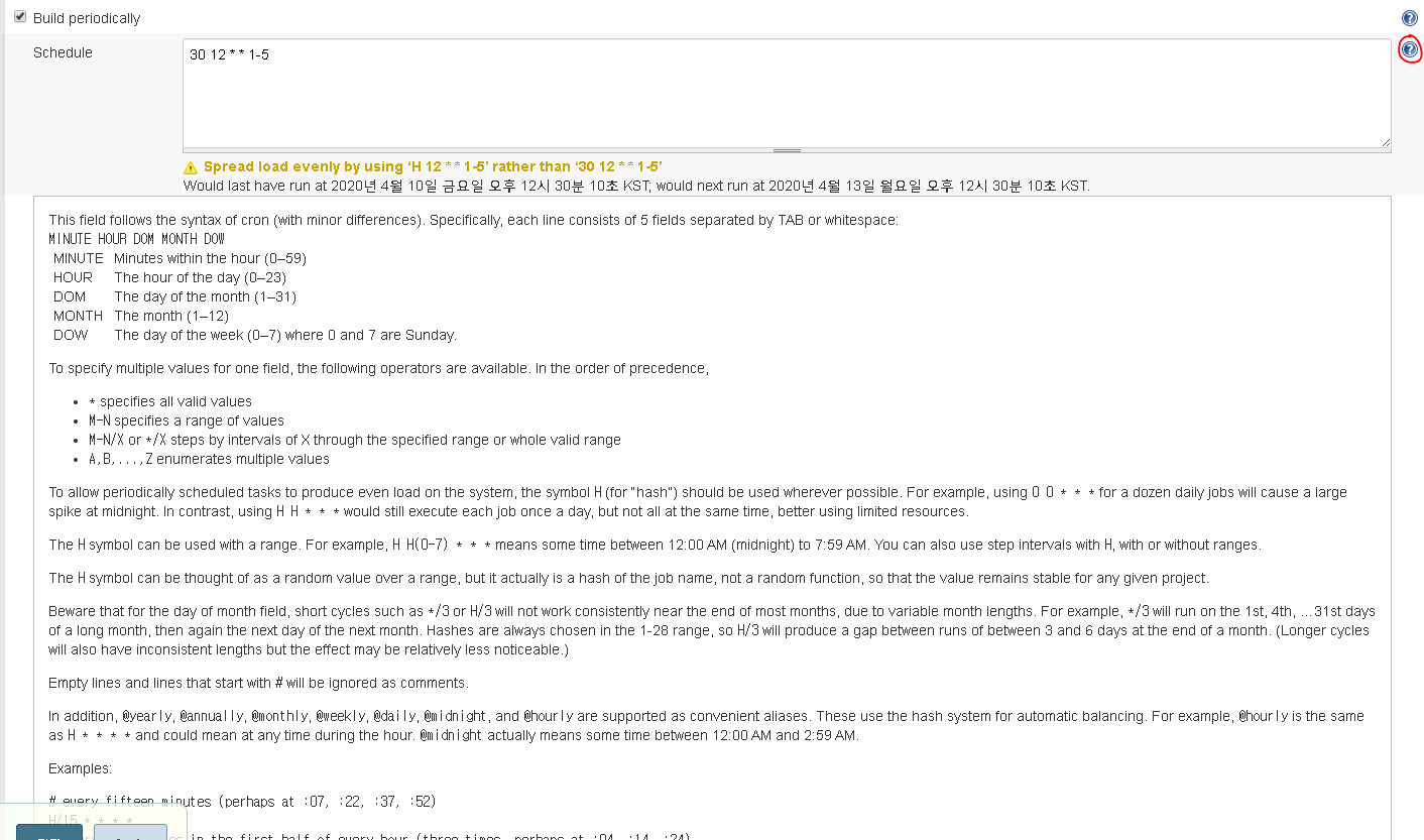 오후 12시 30분 월요일부터 금요일에 빌드한다.(30 12 * * 1-5)